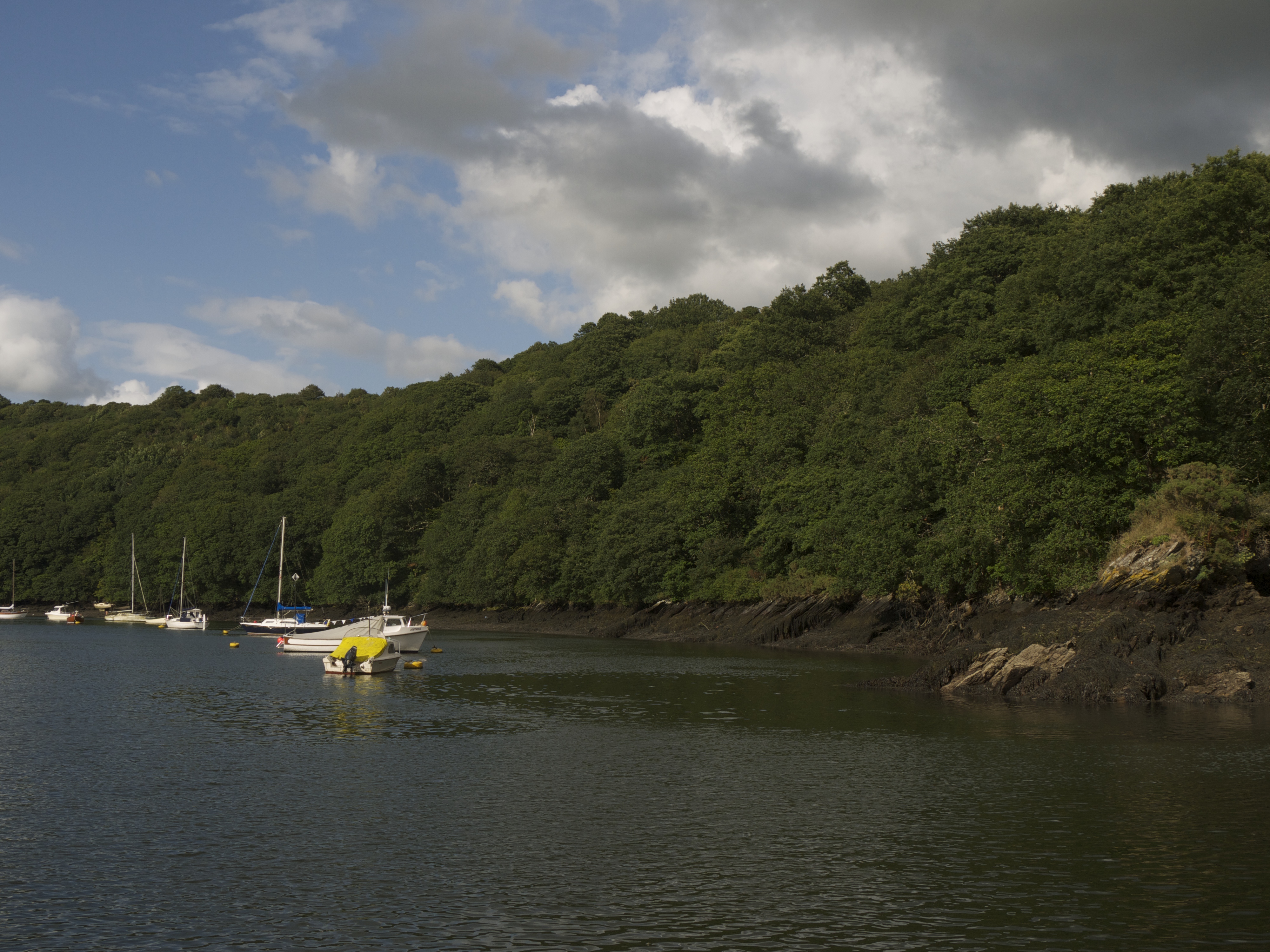 We set off in the tender, under grey skies and with our dirty washing. The trip was a very pleasant potter. We passed numerous moored boats that gradually got smaller in the upper reaches of the river. There’s also a section of river set aside for salmon fishing. We turned off the main river up the Leryn river to Leryn and felt our way up the river, only grounding once on the falling tide. As we crept up the last reach to the mooring the rain started and then it was like a tap was turned on and we were wet through. I stepped out of the tender and slipped on the mud. Soaked through and covered in mud! We looked like a drowned ratty when we arrived at Tom’s mother’s house.